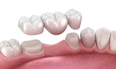 | デメリット | 連結した人工歯を支えるために、両隣の健康な歯を大きく削る必要があります。この処置は、健康な歯の寿命を縮める可能性があるため、大きなデメリットといえます。 さらに、歯を支える歯根の数が少ないため、咀嚼時に通常以上の負担がかかります。 また、抜髄や歯周病のリスクもあります。 多数の歯を失っている場合には、ブリッジは適用できません。 |